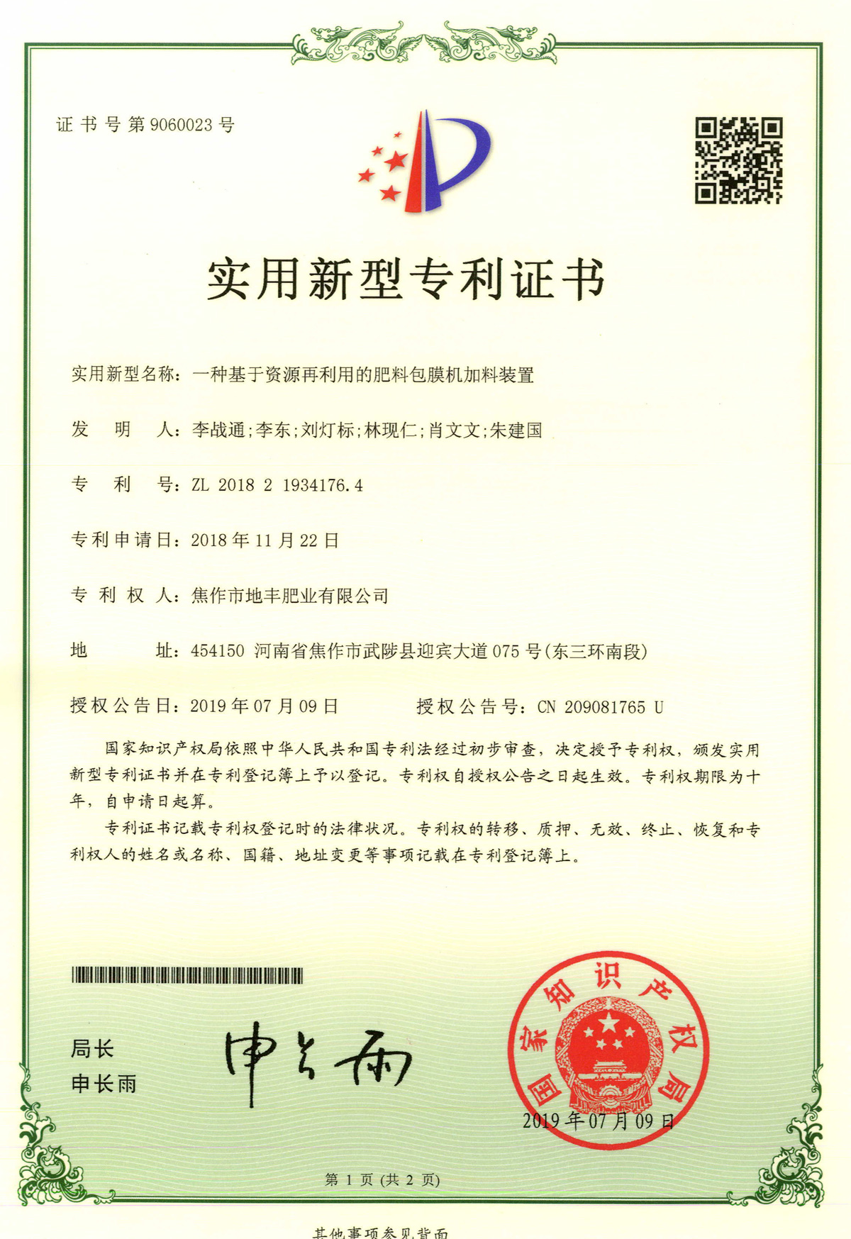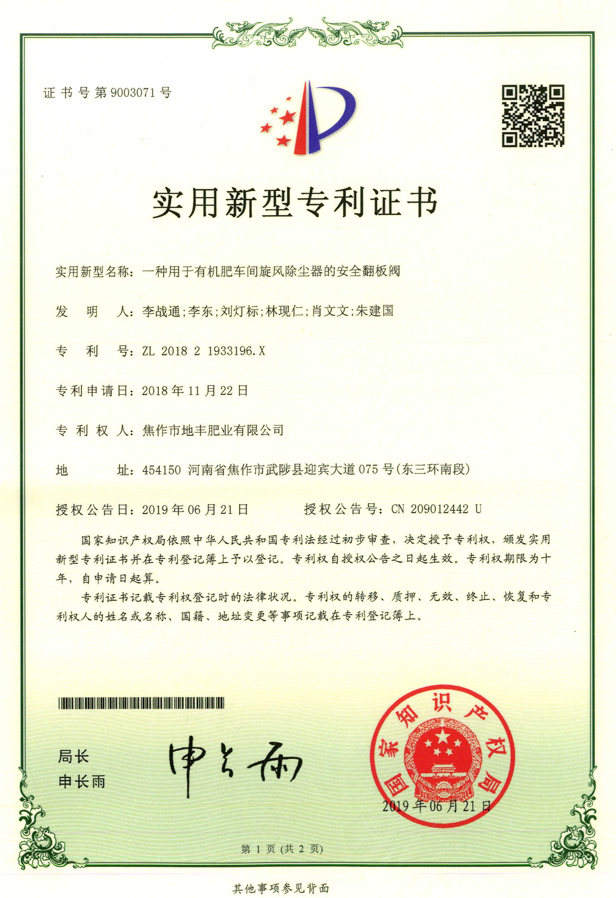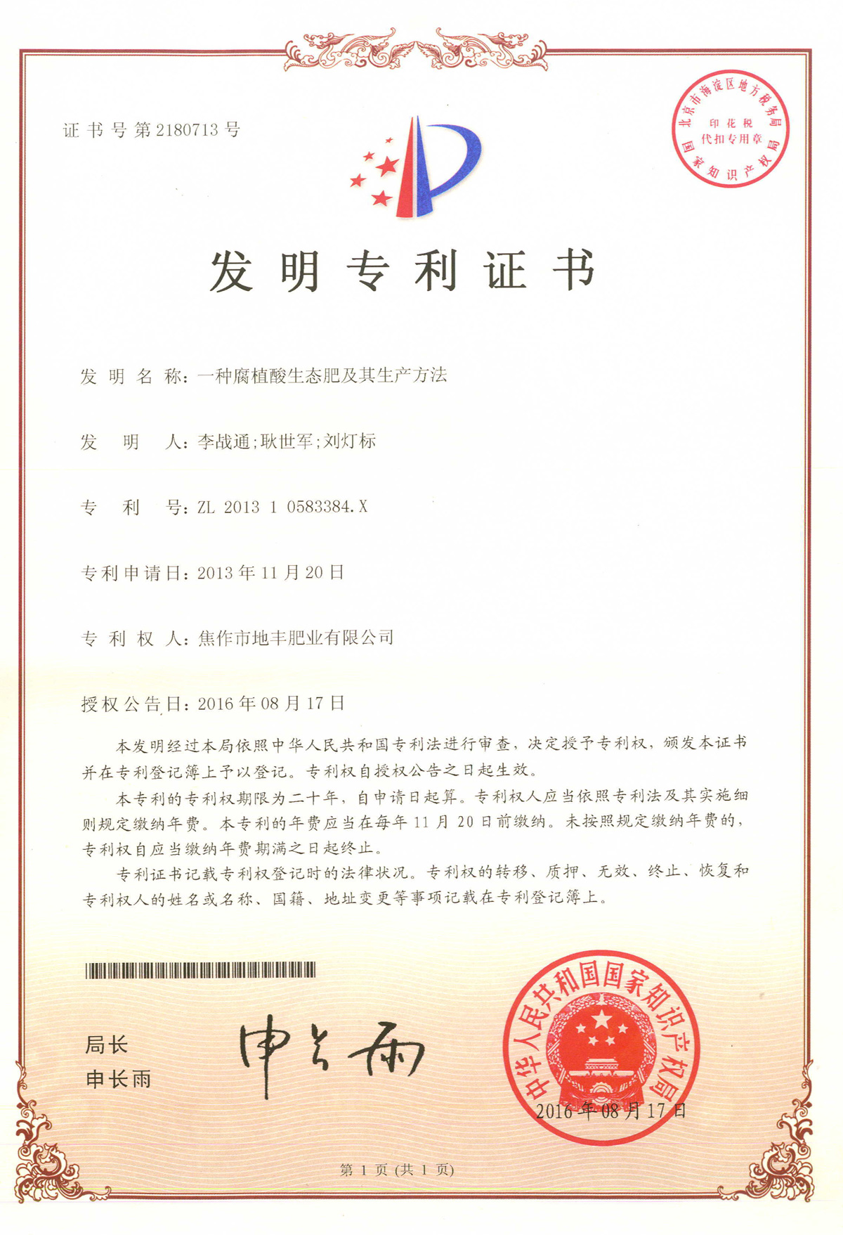 腐殖酸發(fā)明專(zhuān)利證書(shū)