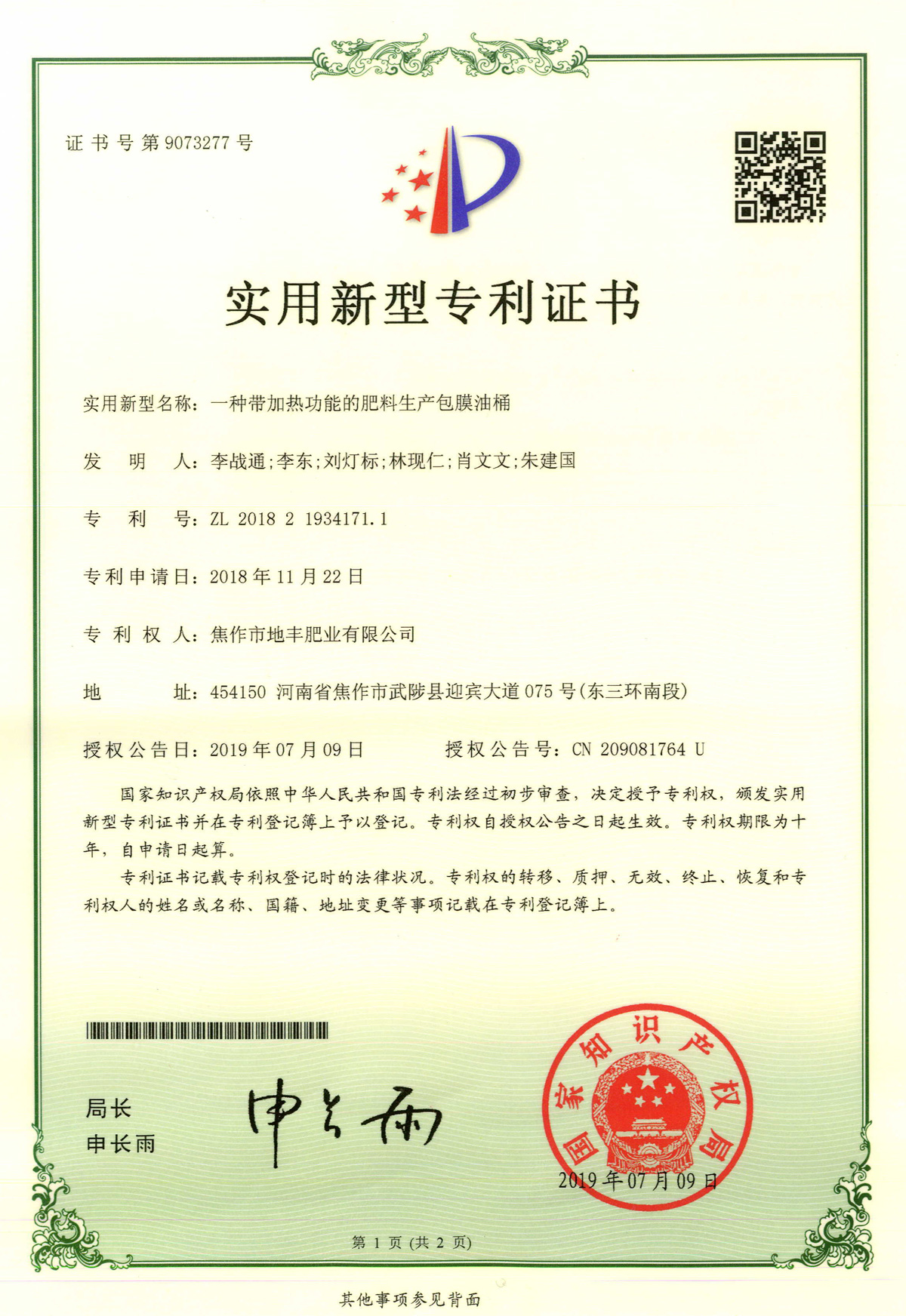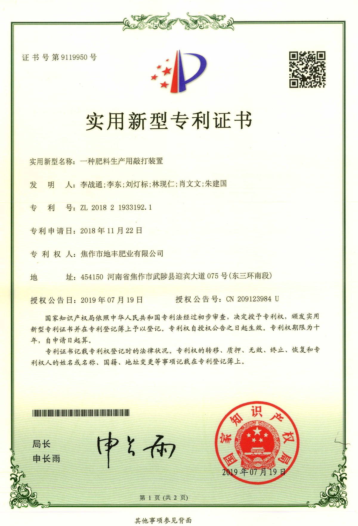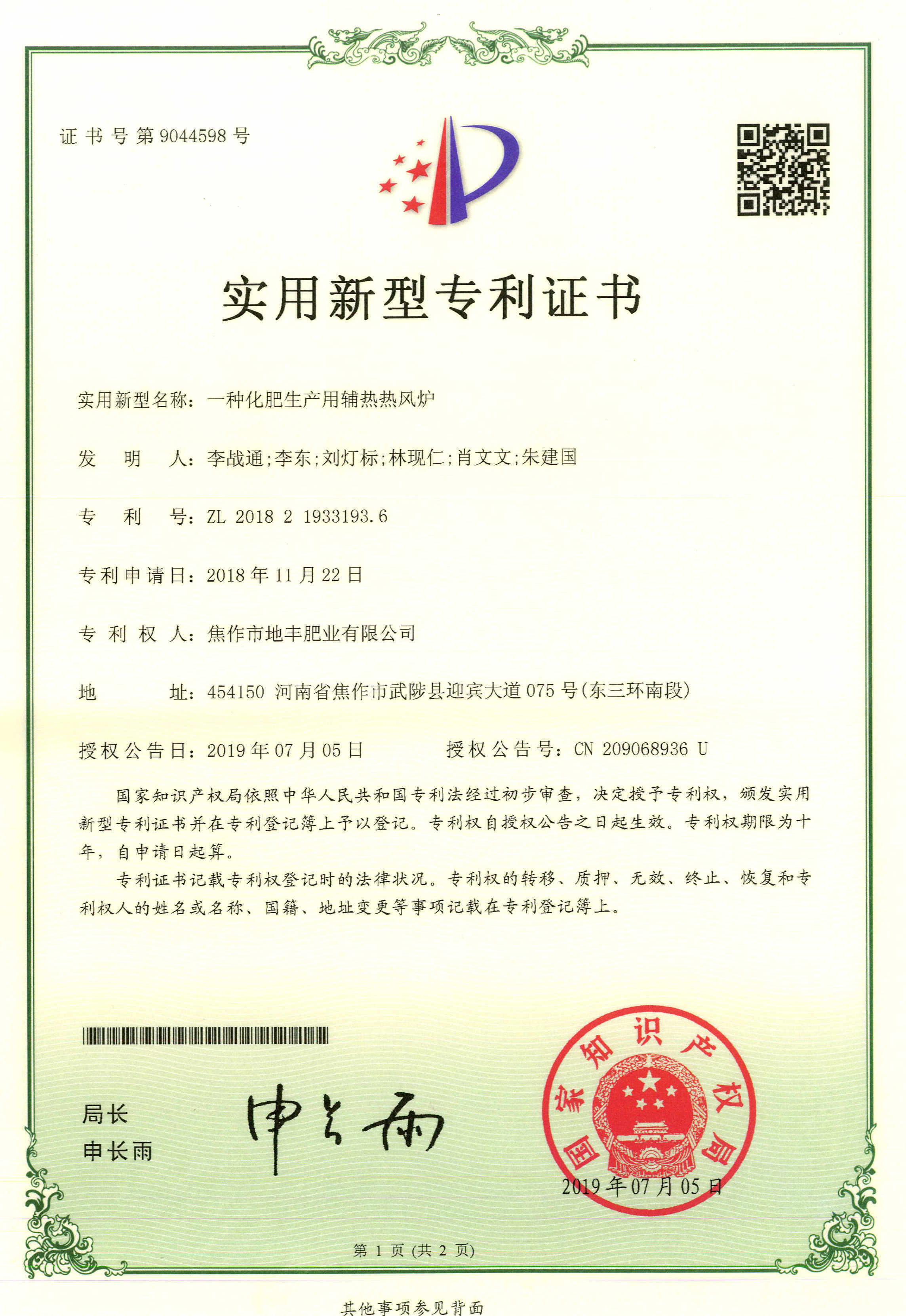 腐殖酸發(fā)明專(zhuān)利證書(shū)